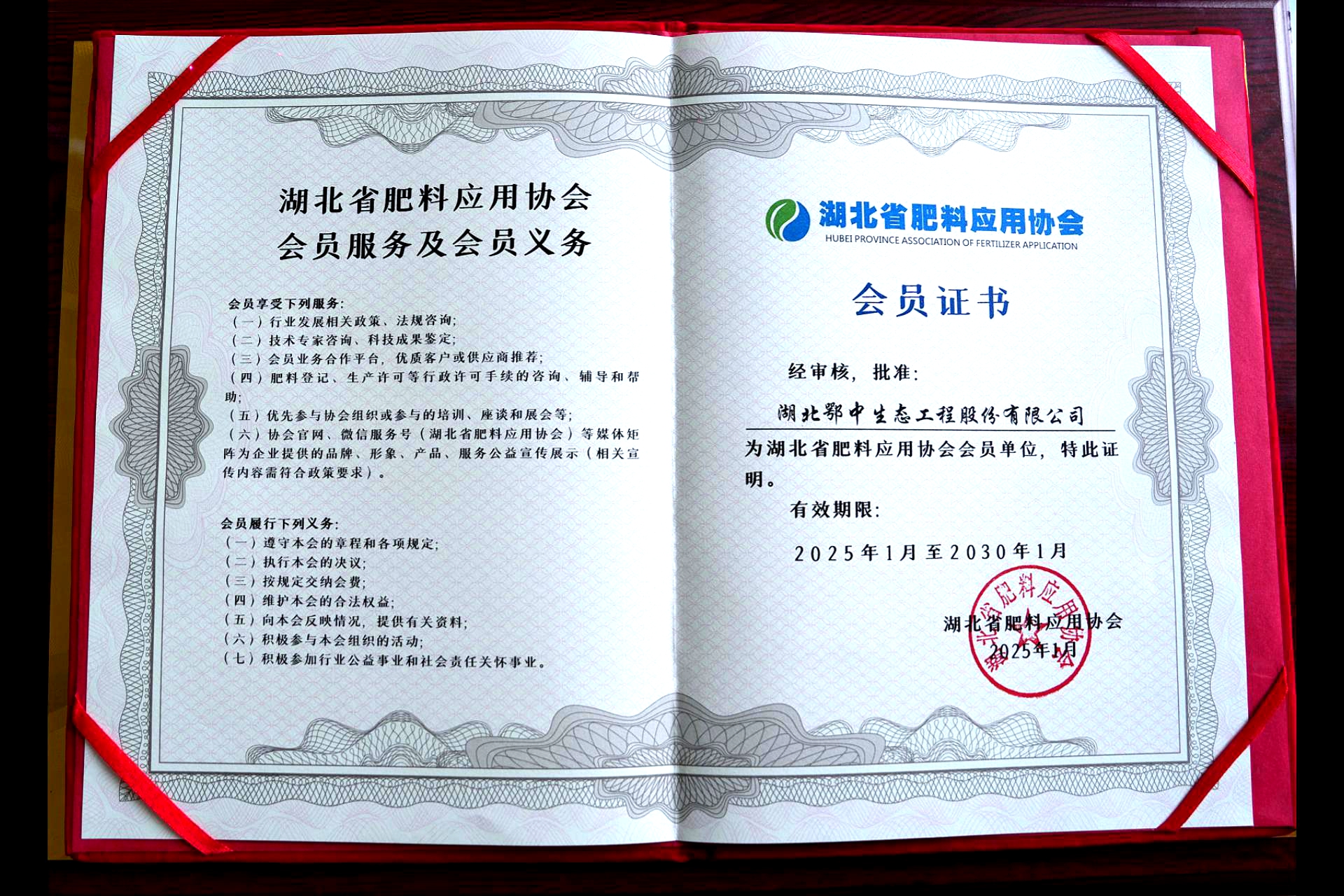 鄂中生態(tài)成為湖北省肥料應(yīng)用協(xié)會(huì)及農(nóng)藥協(xié)會(huì)理事單位