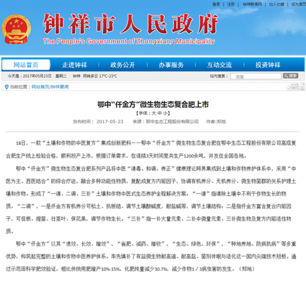 《鐘祥市政府網(wǎng)》、《鐘祥在線新聞網(wǎng)》刊出:鄂中“仟金方”微生物生態(tài)復(fù)合肥上市
