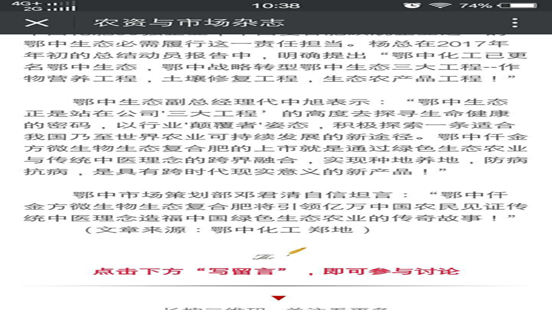 鄂中市場(chǎng)策劃部鄧君清自信坦言:“鄂中仟金方微生物生態(tài)復(fù)合肥將引領(lǐng)億萬(wàn)中國(guó)農(nóng)民見(jiàn)證傳統(tǒng)中醫(yī)理念造福中國(guó)綠色生態(tài)農(nóng)業(yè)的傳奇故事!”