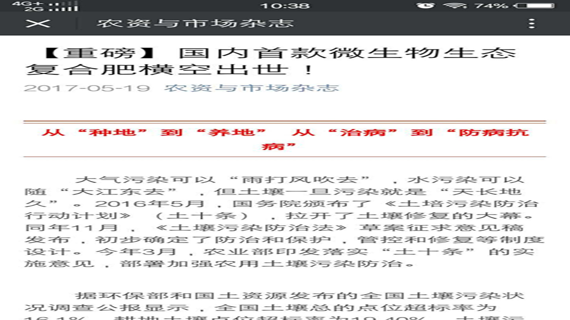 《農(nóng)資與市場(chǎng)》雜志刊出“國(guó)內(nèi)首款微生物生態(tài)復(fù)合肥橫空出世”引起關(guān)注,目前已有10余經(jīng)銷商預(yù)定咨詢?cè)摦a(chǎn)品