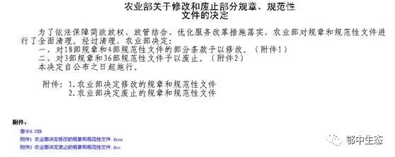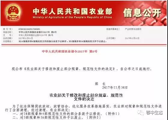 另外,農(nóng)業(yè)部決定廢止《農(nóng)藥管理?xiàng)l例實(shí)施辦法》等3部規(guī)章和《農(nóng)業(yè)部關(guān)于進(jìn)一步規(guī)范肥料登記管理的通知》等36部規(guī)范性文件,列舉部分如下: