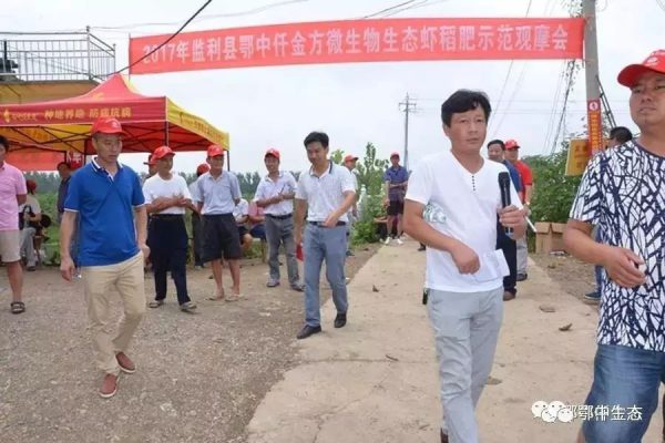 鄂中仟金方微生物生態(tài)復(fù)合肥蝦稻套餐肥就是根據(jù)區(qū)域蝦稻種養(yǎng)面積的擴(kuò)大、水質(zhì)、土壤狀況和蝦稻的營養(yǎng)需肥特點(diǎn),運(yùn)用生物科技,將特定微生物與中低含量復(fù)合肥復(fù)合配制而成。8月9日,鄂中生態(tài)鄂中仟金方示范田觀摩會(huì)在荊州市監(jiān)利縣新溝鎮(zhèn)順風(fēng)村成功召開,監(jiān)利縣農(nóng)業(yè)局耕地質(zhì)量保護(hù)與肥料工作站站長段昌華,鄂中生態(tài)市場策劃部部長鄧君清,鄂南分公司經(jīng)理彭敬祥,新溝鎮(zhèn)農(nóng)技推廣中心主任肖開文和監(jiān)利、潛江、仙桃、江陵、公安、松滋、石首、枝江、洪湖中醫(yī)養(yǎng)護(hù)隊(duì)隊(duì)員及經(jīng)銷商、周邊村民230余人參與觀摩會(huì)。監(jiān)利縣電視臺(tái)參與現(xiàn)場拍攝。