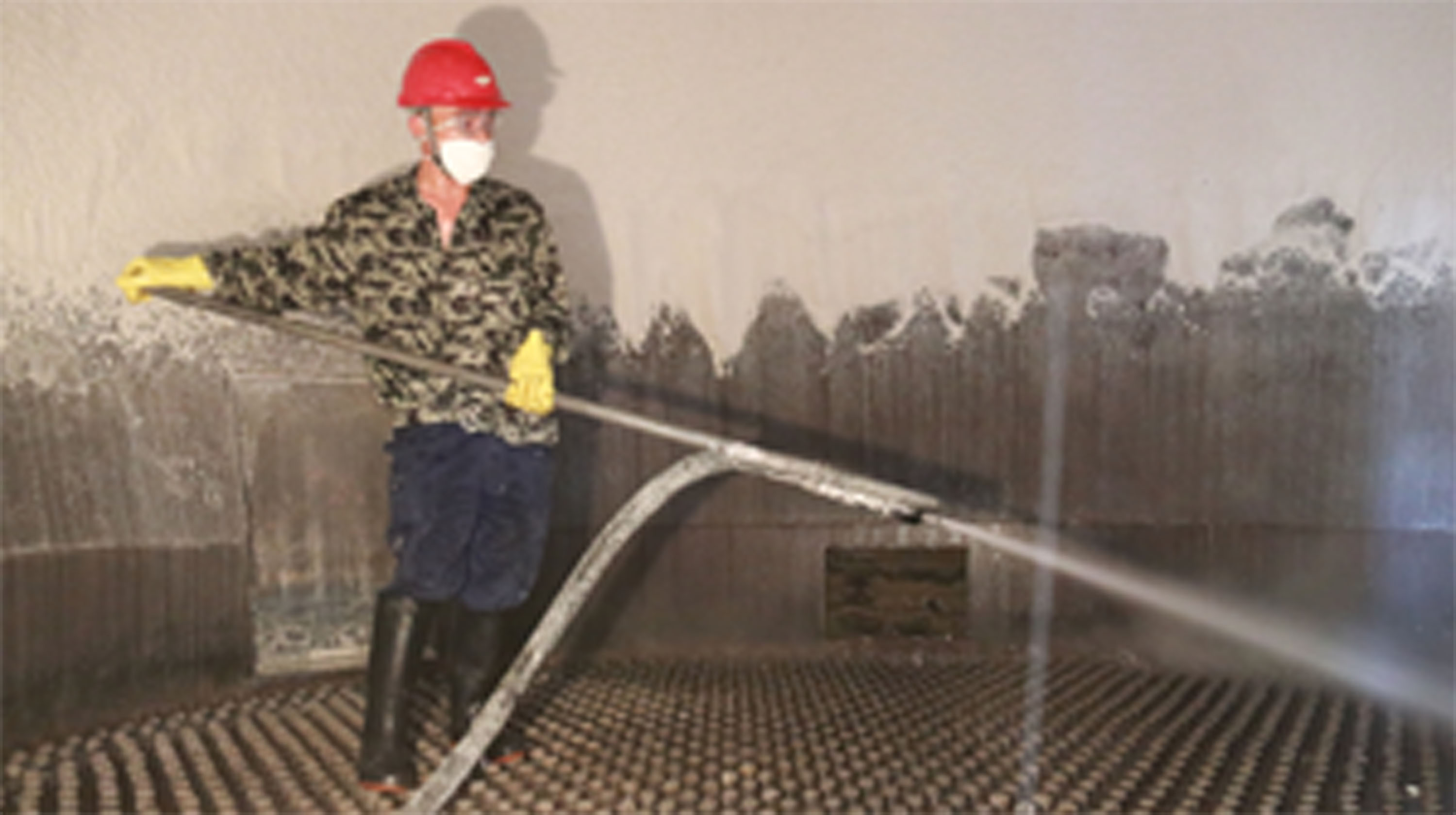 總部磷銨廠噴粉塔內(nèi)溫度高達(dá)80多攝氏度,塔內(nèi)異常悶熱。為保證正常生產(chǎn),該廠每2-3天都會用80多度的高溫?zé)崴畬λ?、床層進(jìn)行清洗。圖為該廠一生產(chǎn)班班長在塔內(nèi)清洗作業(yè)。