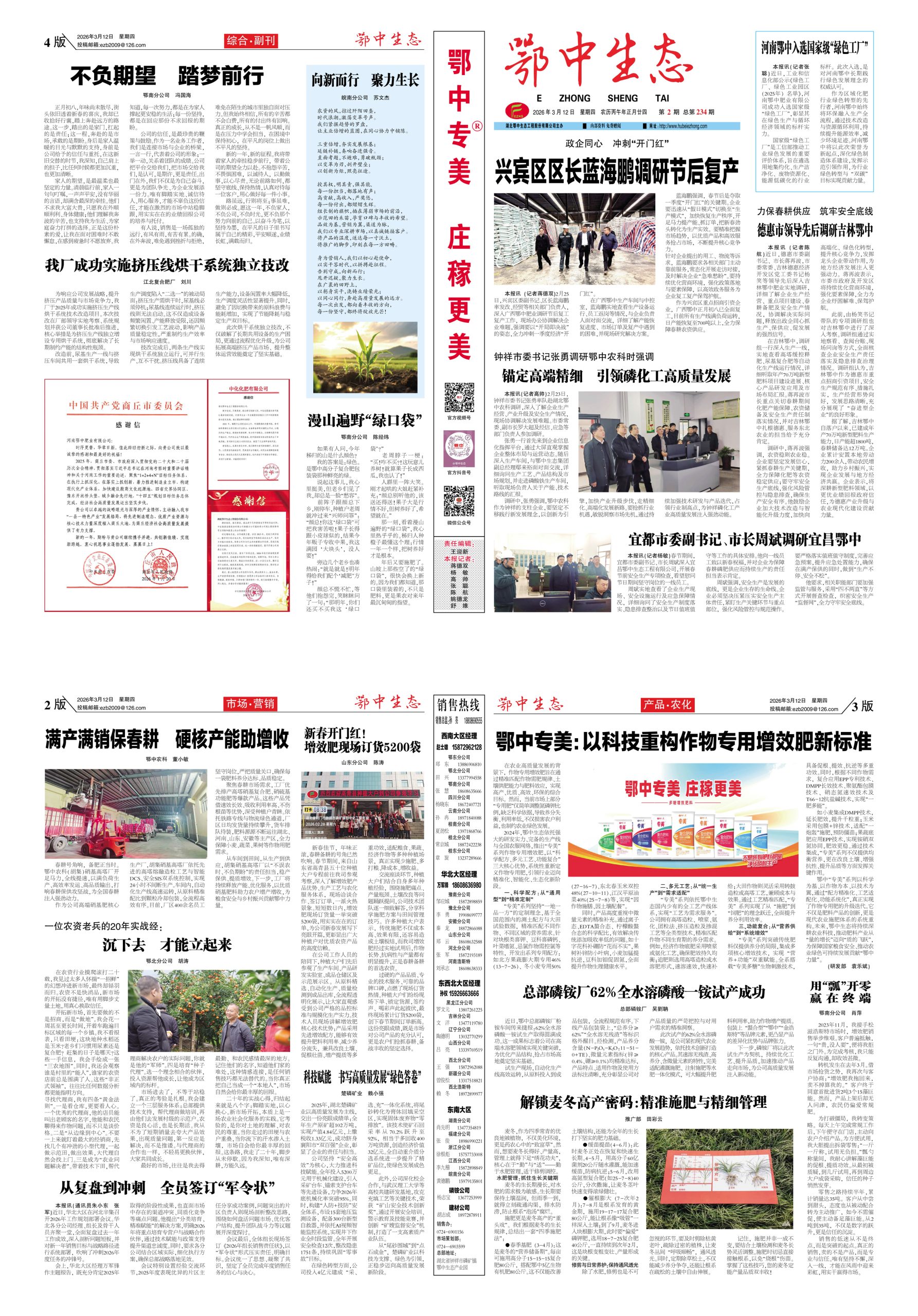 1月12日,鄂中生態(tài)總經理楊華登一行赴寧夏鄂中公司視察指導工作。在寧夏鄂中管理團隊的陪同下,楊總深入復合肥、水溶肥生產車間及原料、成品倉庫等核心區(qū)域,實地調研設施運行與生產管理情況。